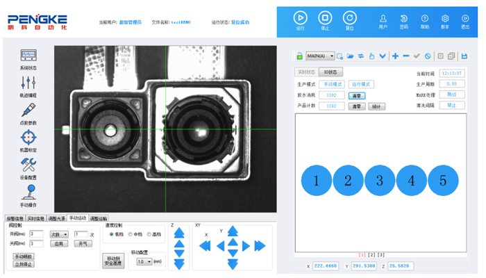 视觉显示-中间黄色边框内:实时显示CCD的成像内容,用户可在该区域依靠鼠标点击的方式移动设备各轴,实现“看到哪、点到哪、移到哪”实现路径编辑、视觉校正等功能的快速操作。